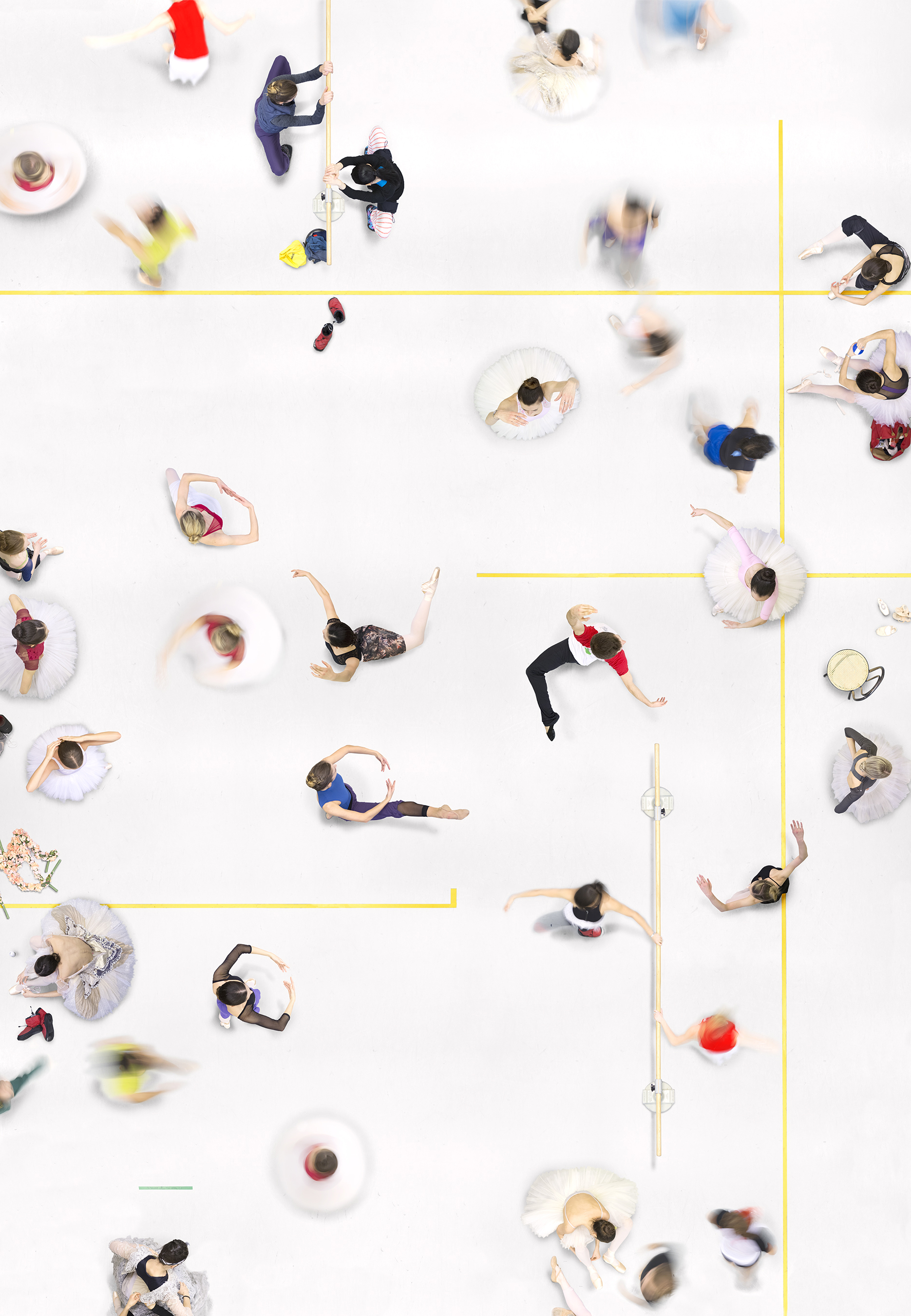 In Amsterdam, a rehearsal for the ballet piece Sleeping Beauty by the Dutch National Ballet is in full swing: from the stretching on the ground, to the exercises at the barre and finally the elegant poses and pirouettes of the corps and solo dancers. A ballet shoe is being laced, jackets and long trousers are being taken off and costumes are zipped up. There is a certain crescendo within the process of shedding layers of clothes as part of the dynamics and rhythm of the rehearsal. In the picture, you can feel the movement of the dancers, but it is not yet fully coordinated. The lines and dots on the floor are codes that tell the dancers how and where to move. Some props that are used in the show, like flowers, are also part of the rehearsal scene. The practice and repetition of the dance until perfection are part of a production process. Despite the cleanliness and the assumed fragility, it is the hard physical labour that makes this workplace so fascinating.