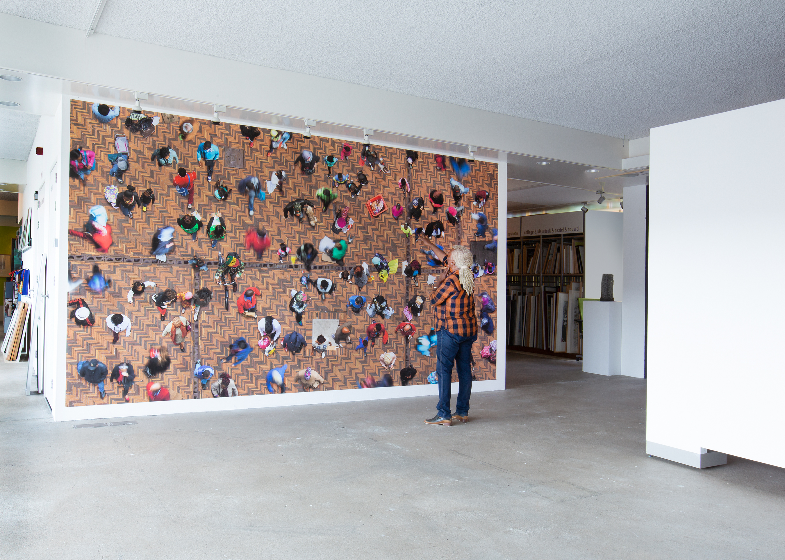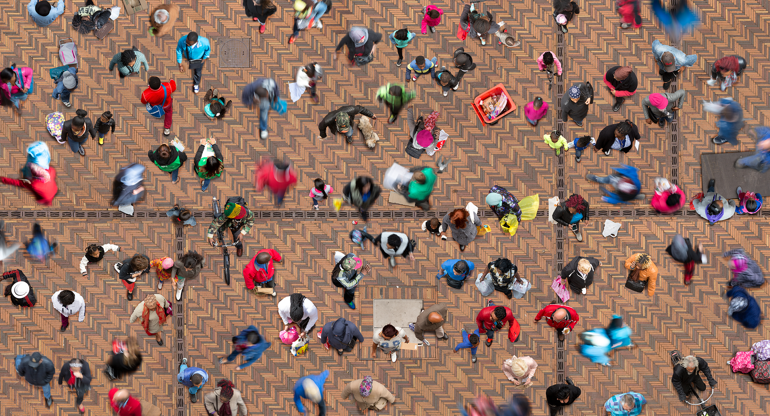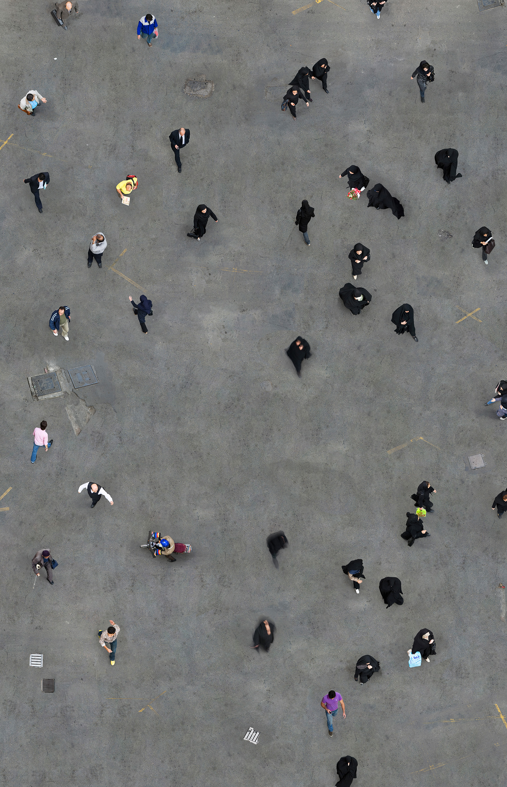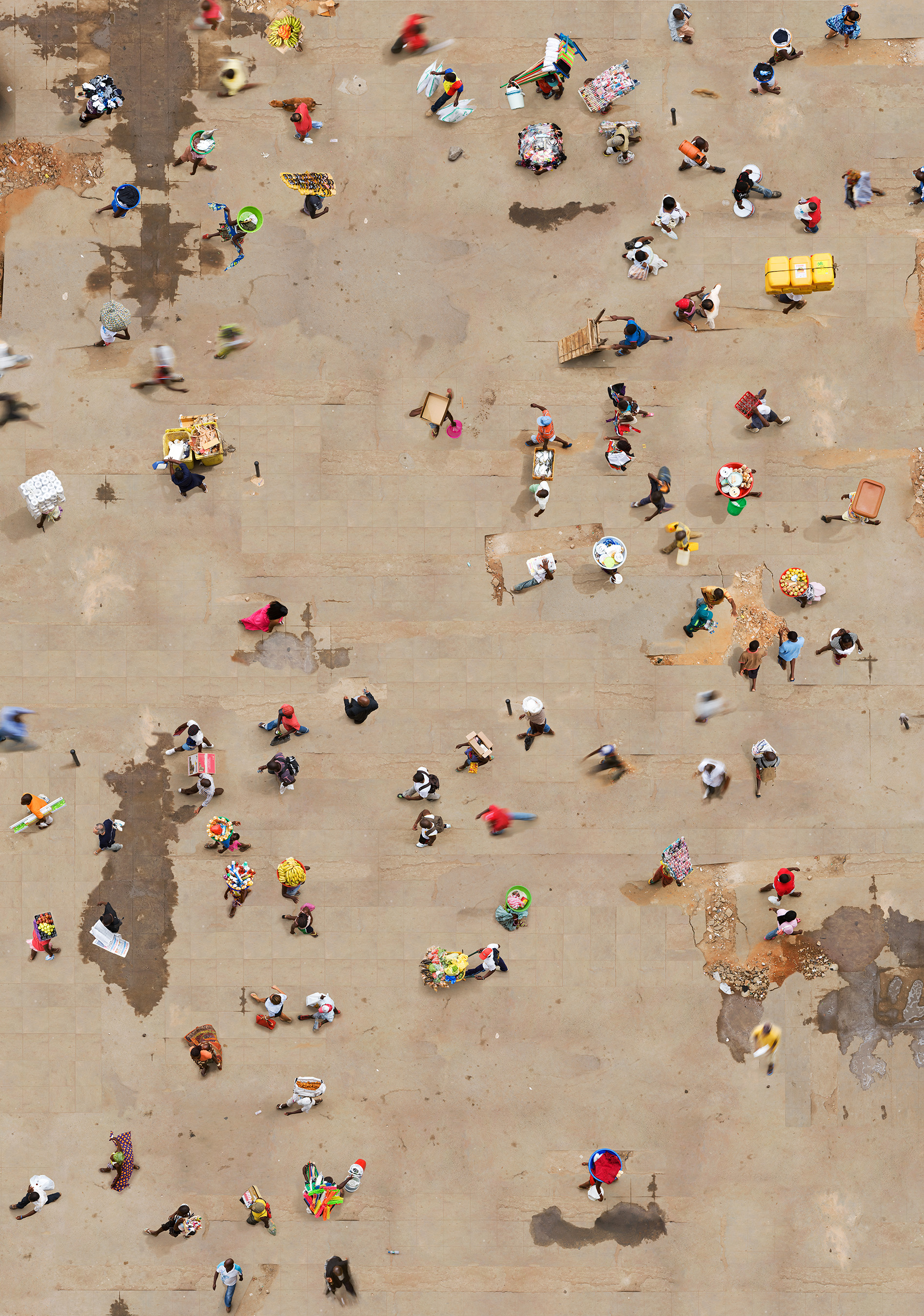 Korfmann aims to capture the memory of a place in designing a literal image of time. The essence of both is the background, the flat surface to which she refers as 'space zero', on which she groups the different fragments of memory captured by the camera. This way, the originally two dimensional surface has become a new, more or less virtual space. Even though the works to be seen in the show Count for Nothing originated at totally different locations on the globe, people do not look that different when seen from above. Only at a closer look, different cultures and rituals will become visible; such as products being carried on the head in the photo from Luanda (Angola). Also the black dresses of the women in Teheran relate to the Academic robes worn by the graduate students of the University of Cambridge.