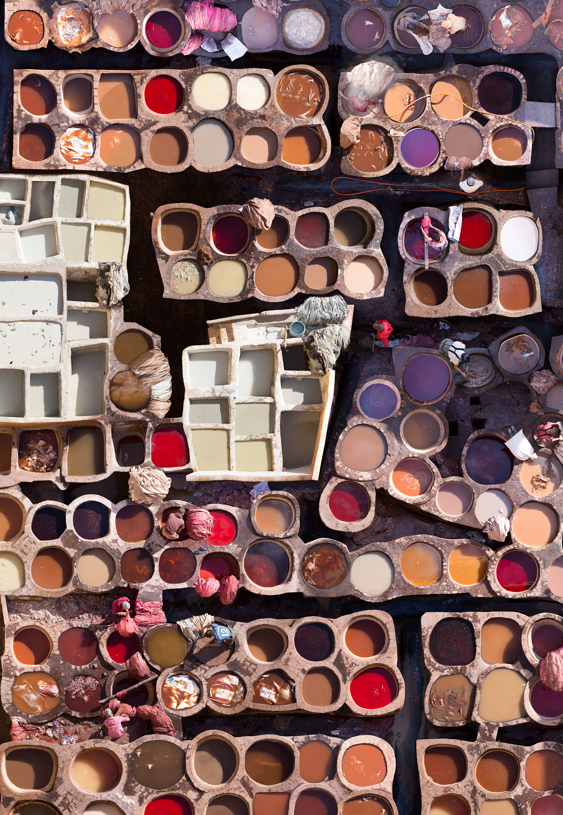 Family run cooperatives have been tanning leather in Chouara for the best part of 1000 years. Located in the old town of Fez and still fully functioning, this ancient industry has become a popular tourist destination. The basins depicted are filled with the dyes used by the workers and although the site and its surroundings are beautiful, the smells coming from it are repugnant. The reason for the strong odour is the pigeon droppings that are being used to unhair the hides. The basins in which the skins are dyed are quite large, with some pots measuring 1.50 meters in diameter. Once a week, all the dyes in the pots are renewed and the colour combinations are constantly changing. All the colours are made with natural materials such as poppy seeds and saffron. The tannery has been an independent selfsufficient business for hundreds of years, that also includes the many shops surrounding it.