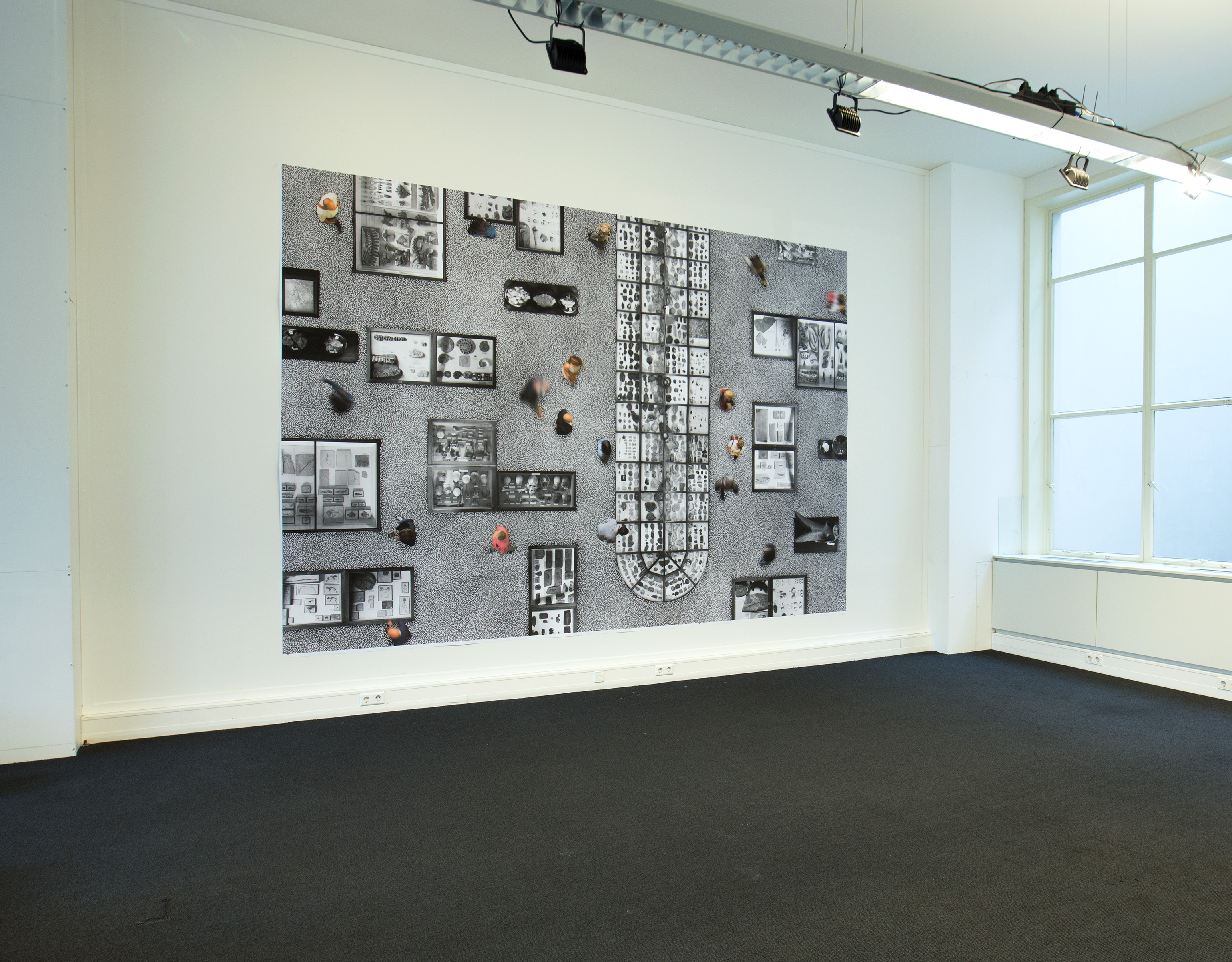 Founded in 1784, the Teylers Museum is the first and oldest museum in the Netherlands. It is a museum for both art and science that displays artistic endeavours like paintings alongside scientific objects and paraphernalia. The long vitrine in the middle of the picture is unique and typical for the museum. The museum even has several fake artefacts on exhibit, a prank that malicious colleagues pulled on the collector and amateur-archaeologist Johann Beringer. As the picture is quite large you can see all the details of the fossils and skeletons. The vitrines, the objects, and the floor are all in black and white while the visitors are portrayed in colour. This is to emphasise the contrast between the history of the museum and the dynamics of the people present. This work is an interpretation of a classic display that shows the collecting and archiving of artefacts. It elucidates that art, or the perception of art, is not exclusively reserved for the process of conceiving or making but still happens in the 'afterlife' of objects.
