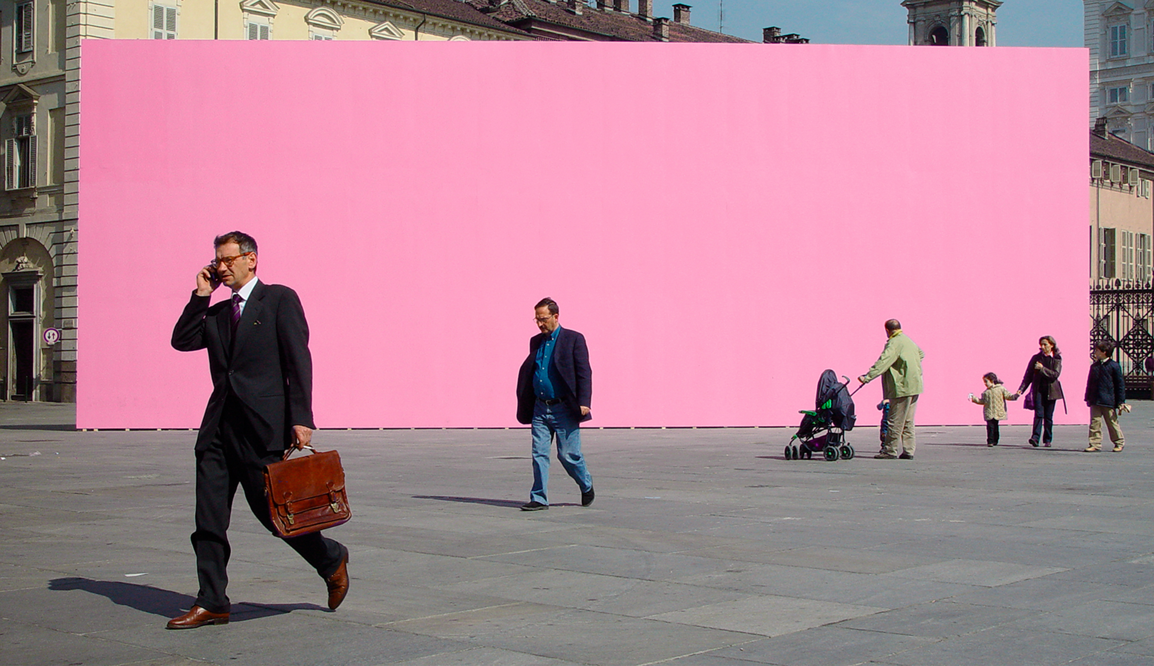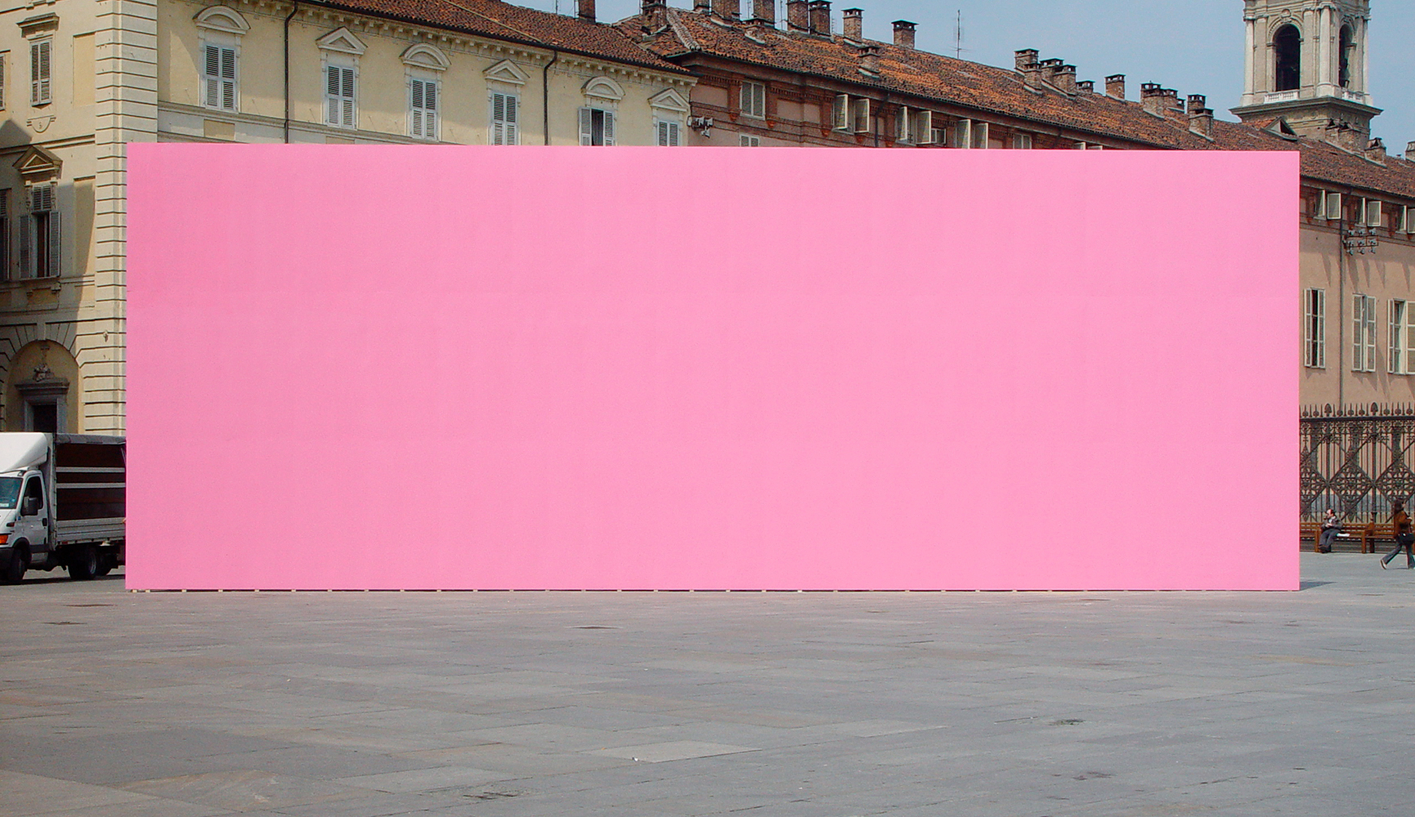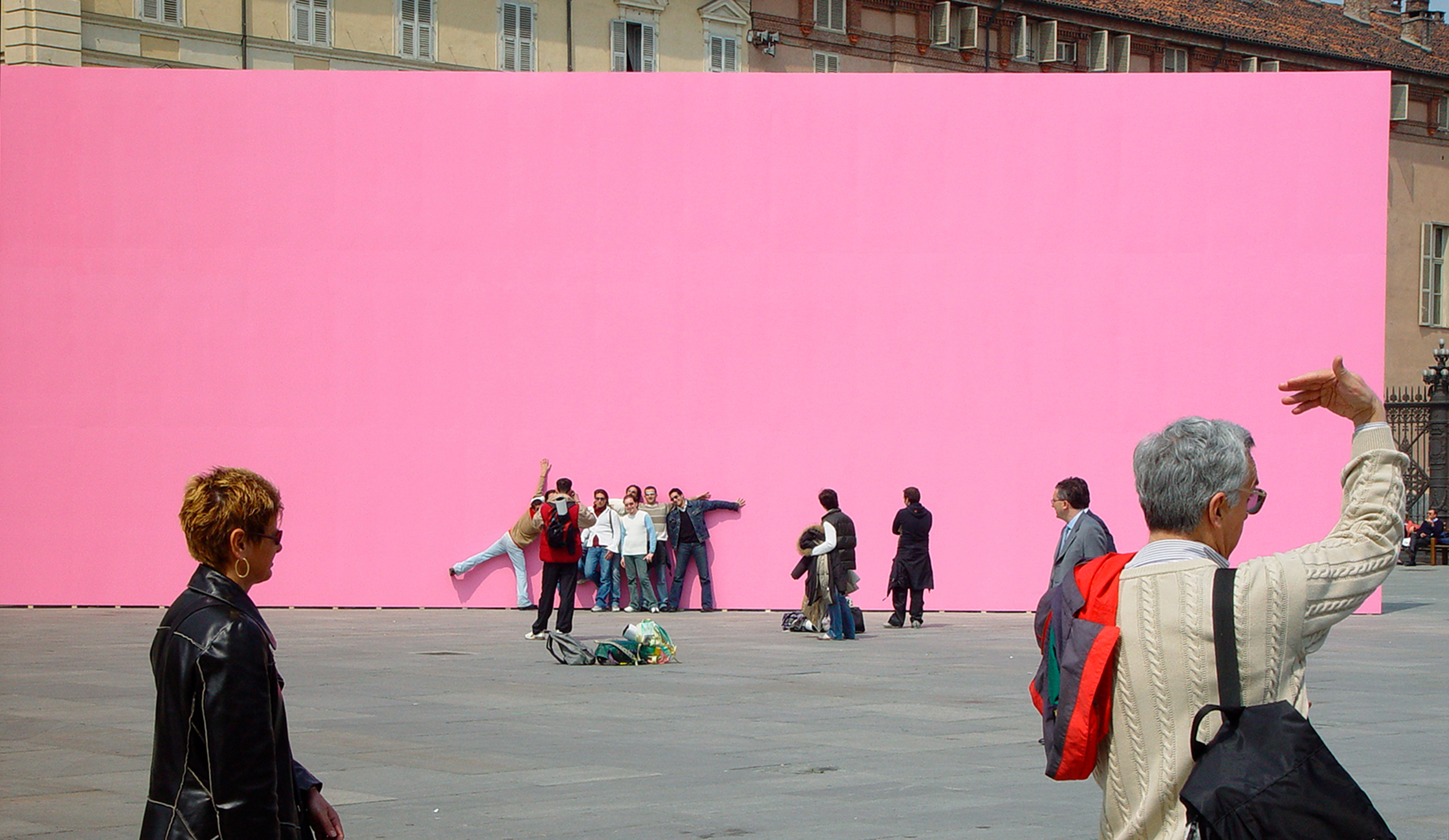 In this temporary installation a monochrome wall of 6 by 20 meters was erected on a classical Italian square in Turin. On a location laden with symbolism and history the wall forms a neutral surface, albeit with a colour which evokes all sorts of associations and which may seem strange in this particular place. Not necessarily recognizable as an art work, the wall forms an abstract object in public space, not yet occupied by evident meanings, yet contributing a new empty space which can be filled in by people passing by who may be inspired to pose in front of it, photograph each other and record the environment from a new perspective. The wall forms a screen against which, as is the practice at a photo studio, people appear as models disconnected from their context. This theatrical installation forms a research into the process of perception involved in making photographs for which we inevitably make choices in how we frame our surroundings. The artist here does not decide upon the moment or the perspective of the registration herself, but creates a situation in which this responsibility is given to the participant of the work.