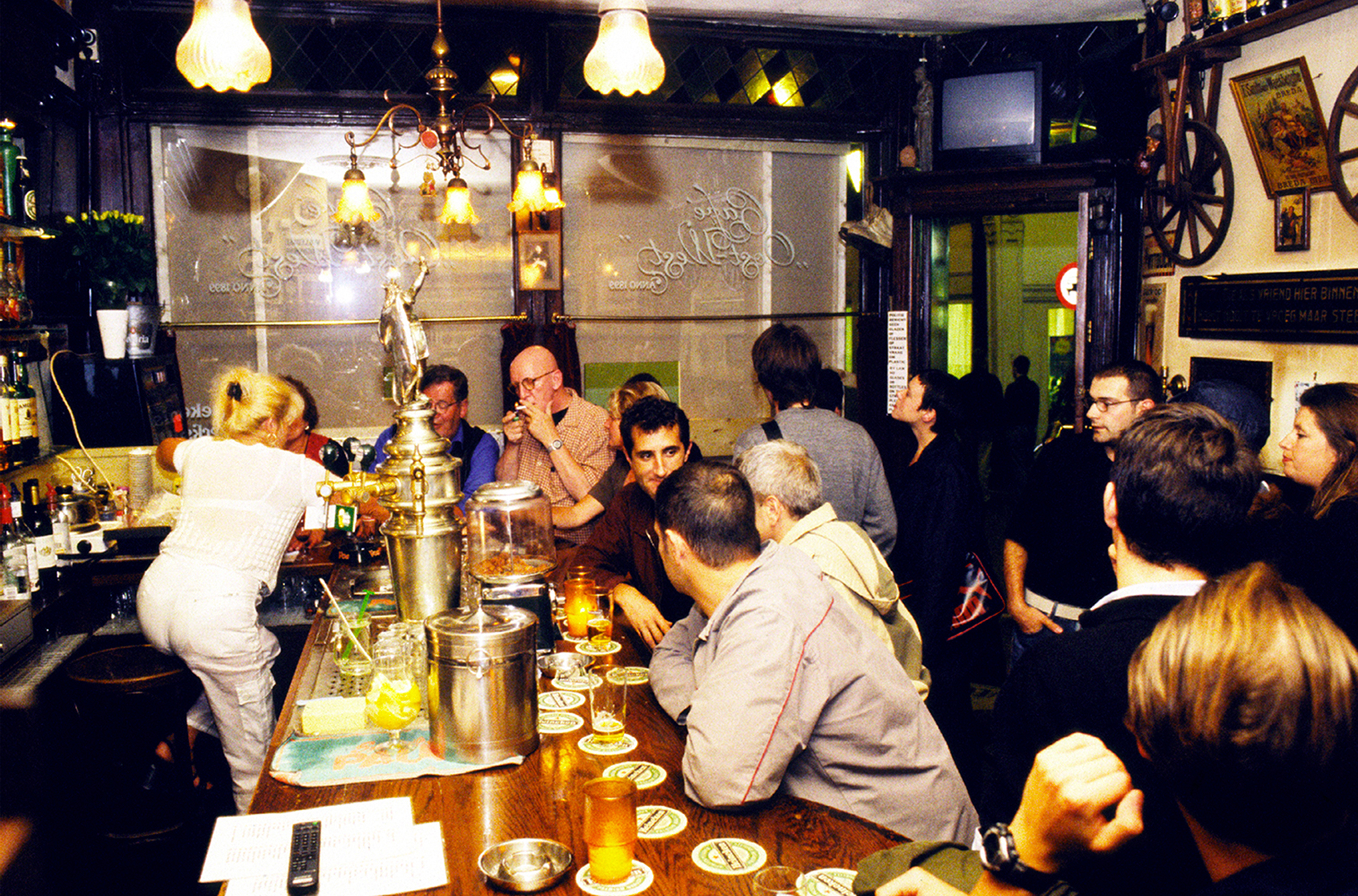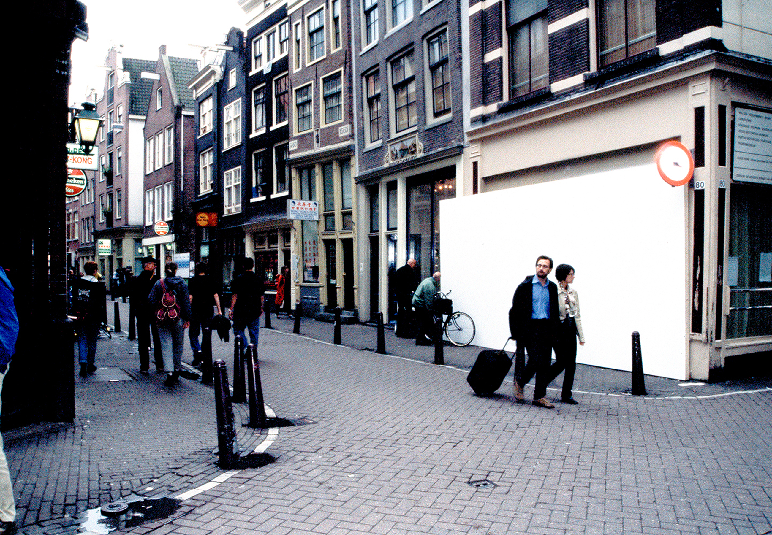 A frame was put on the windows of a local ‘Bruin café’ on the Zeedijk in Amsterdam, drastically curtailing the viewing space, so that it became a kind of viewing lens. On the opposite side of the street, a white wall of about 8 meters long and 2,5 meters wide was built.